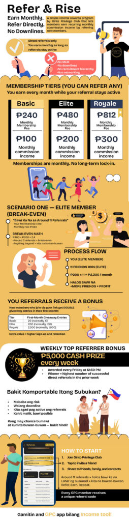 Refer & Rise is GPC’s referral program that allows you to earn recurring monthly income by simply sharing Ginto Privilege Club with people you trust. When someone joins through your referral and remains a member, you receive ongoing rewards—month after month.